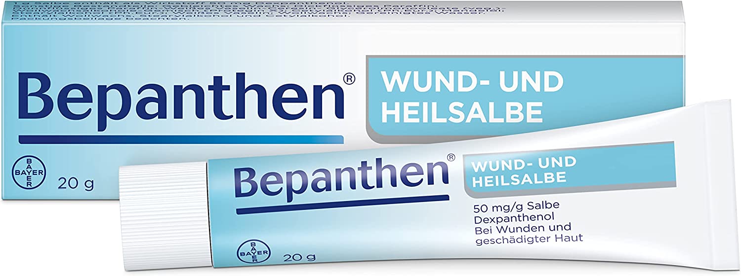 (1) Bepanthen® WUND- UND HEILSALBE. Wirkstoff: Dexpanthenol. Anwendungsgebiete: Zur Unterstützung der Heilung bei oberflächlichen leichten Haut- und Schleimhautschädigungen. Hinweise: Enthält Wollwachs, Stearylalkohol und Cetylalkohol. Packungsbeilage beachten! Zu Risiken und Nebenwirkungen lesen Sie die Packungsbeilage und fragen Sie Ihren Arzt oder Apotheker. Bayer Vital GmbH, 51368 Leverkusen, Deutschland. Stand: 09/2020.